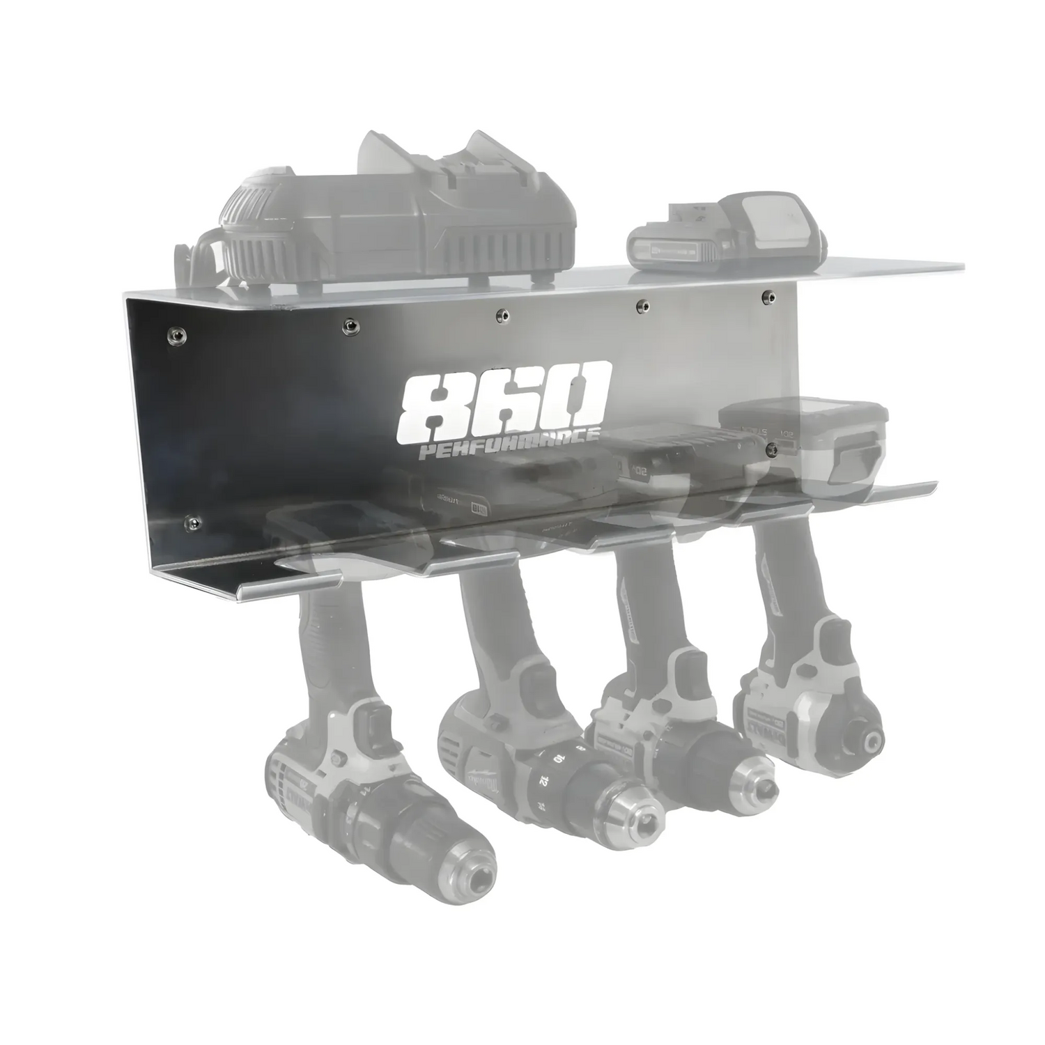 Introducing the 860 Performance Cordless Tool Holder – a versatile solution for your workshop or trailer. Crafted from robust .125" thick aluminum, it's designed to hold up to 4 cordless tools with ease. The convenient shelf is perfect for storing spare batteries. With mounting holes spaced 16" on center, installation is a breeze. Organize your tools efficiently and enhance your workspace with this durable and practical cordless tool holder. Ideal for shops or trailers, it's a must-have for any workspace where accessibility and organization are key. Available in a Raw Finish or with a with a sleek powder-coated matte texture black finish for added style and durability.