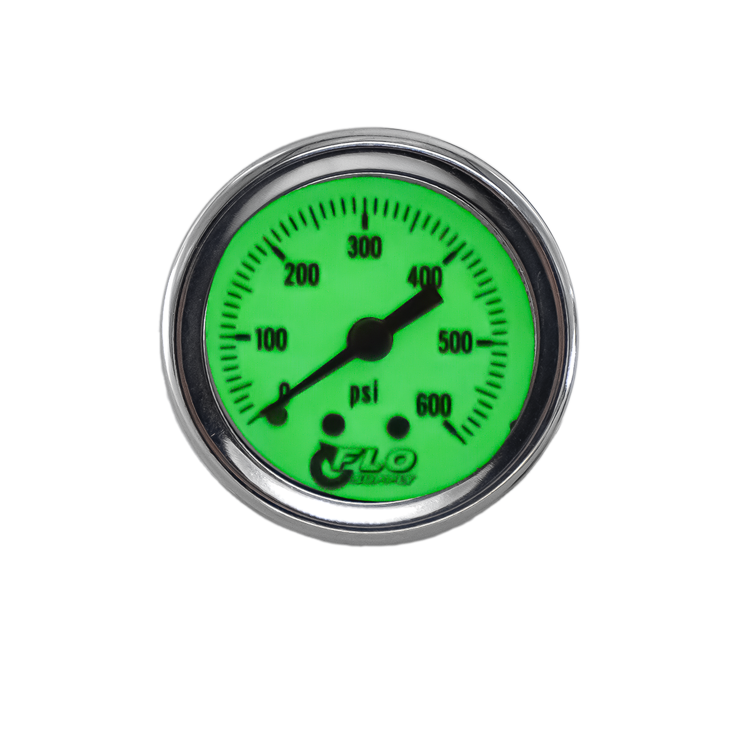 The Flo Supply Luminescent CO2 Pressure Gauge offers precise readings from 0-600 PSI with a 1.5" white face that glows in the dark for easy visibility in low light. Built with a stainless steel case and internal components, this gauge ensures durability and corrosion resistance. Featuring a 1/8" NPT male back inlet, it’s ideal for compact and efficient CO2 system requirements.