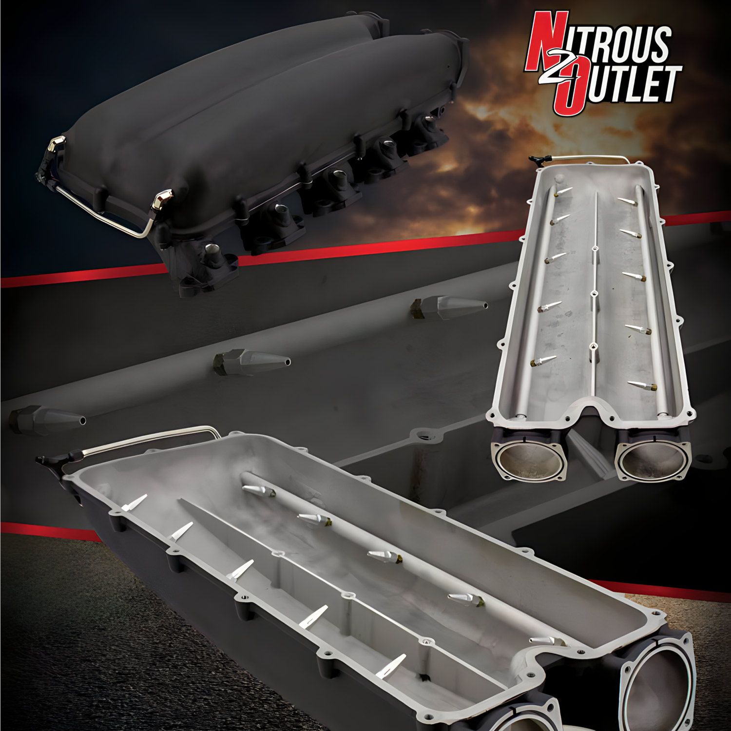 The Nitrous outlet Inner Plenum Direct Port System is custom built to each intake manifolds unique requirements. The Inner Plenum Direct Port is designed to work in most intake manifolds with a large open plenum. The installation of the Inner Plenum Direct Port System requires sending the intake manifold to Nitrous Outlet. Nitrous Outlet machines the intake and components, then installs them making sure that the discharge ports perfectly align with each intake runner.