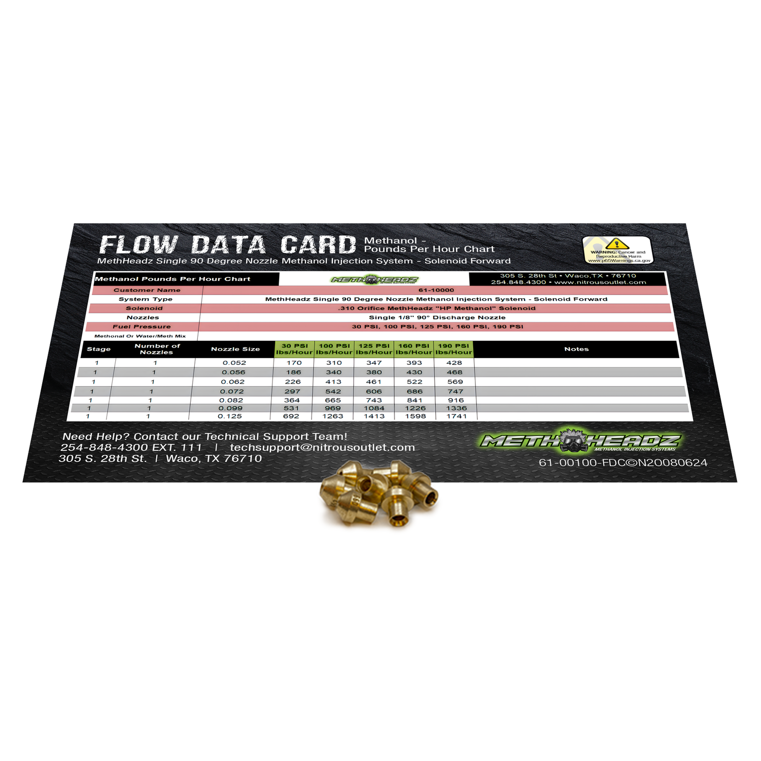 The MethHeadz Single Nozzle Jet Pack is engineered for optimal performance, using flow bench data tailored for the MethHeadz Single 90 Degree Nozzle Methanol Injection System. This Jet Pack features a comprehensive flow data card, providing accurate fuel flow measurements in pounds per hour at five pressure settings: 30 PSI, 100 PSI, 125 PSI, 160 PSI, and 190 PSI.