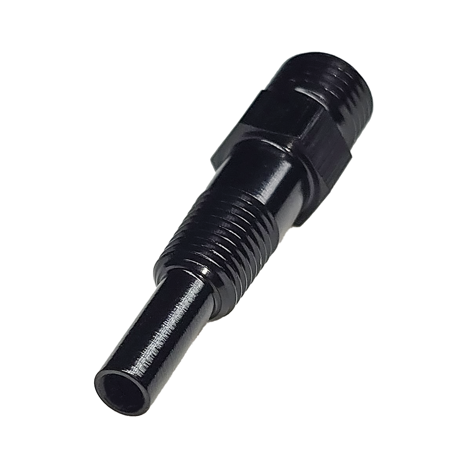 This dry nitrous nozzle features a straight discharge pattern and a .130" internal diameter for efficient, high-flow delivery. It uses a standard 1/16" NPT thread for easy installation. Machined from billet aluminum and finished in black anodizing, it offers strength, durability, and corrosion resistance. Supports up to 450 horsepower.