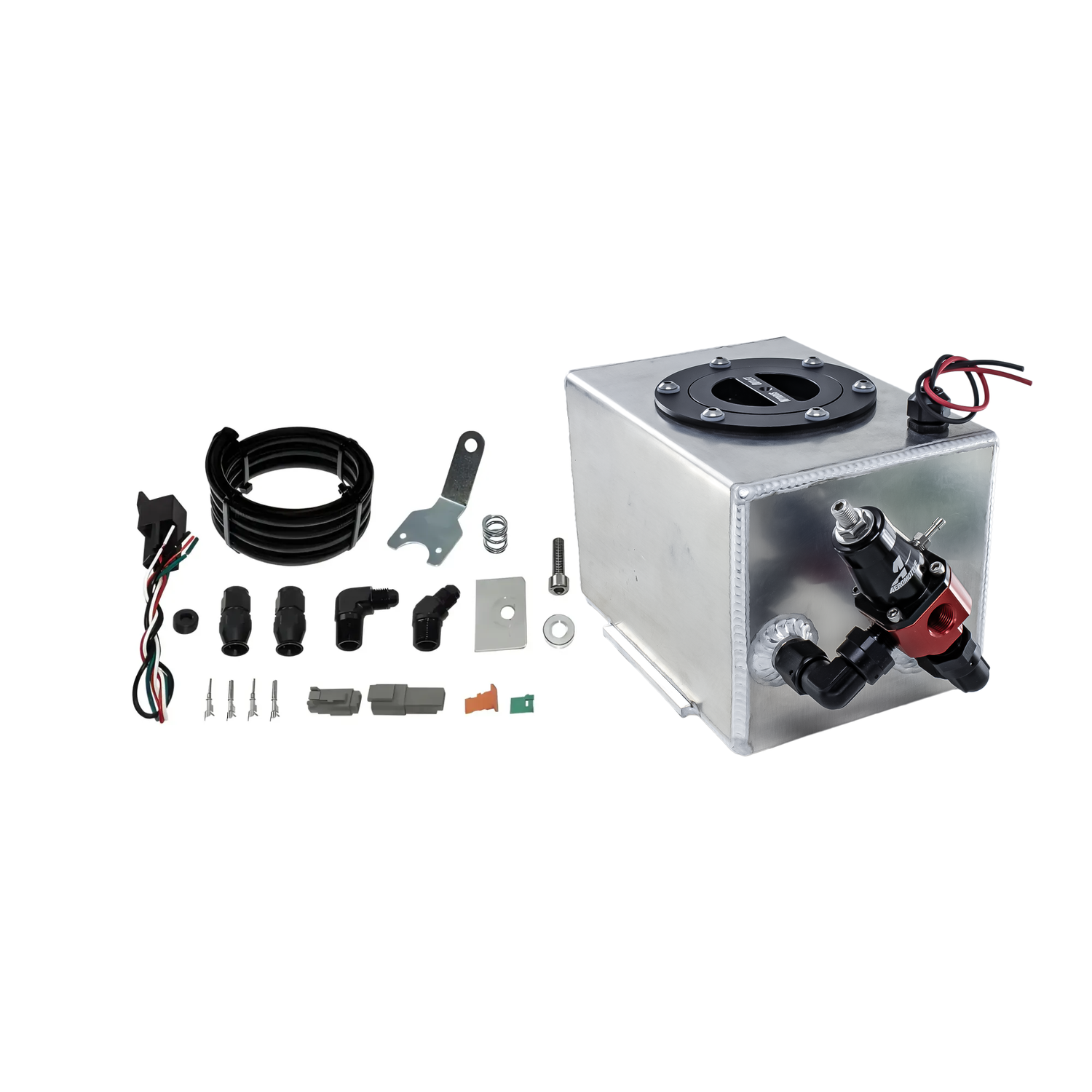 Nitrous Outlet's dedicated fuel systems come complete with a custom built hand welded 1.55 gallon fuel cell, mounting brackets, E85 compatible in tank fuel pump, Aeromotive fuel regulator, E85 compatible 6 AN hose, fuel lines, and fittings. All tanks are laser cut and welded in house from .125" 5052 aluminum.