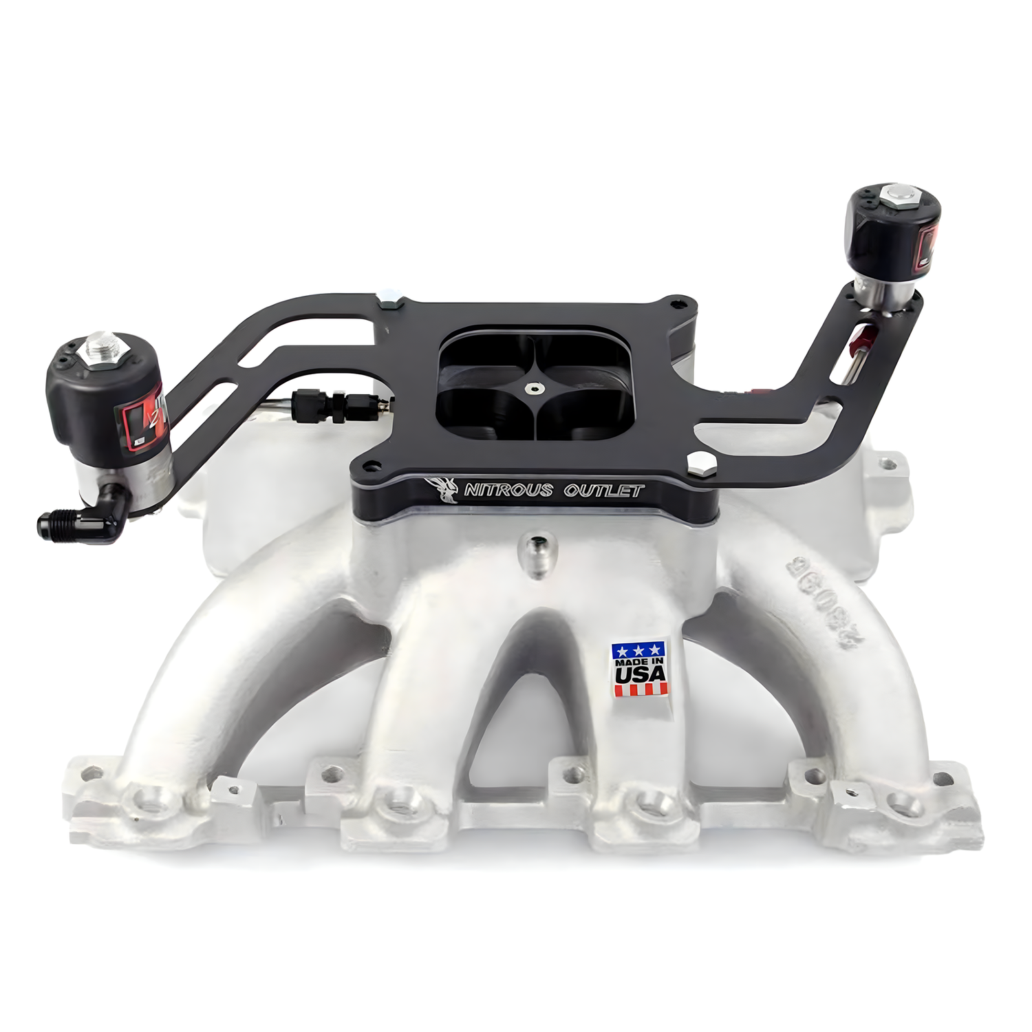 Specifically for intake manifolds with a carburetor or throttle body and commonly used in conjunction with Nitrous Outlet's Puck system, spray bar system, Stinger plate system or Hornet plate system. The "Boomerang" design eliminates commonly found issues associated with accelerator pumps and fuel feeds on most carbureted applications.