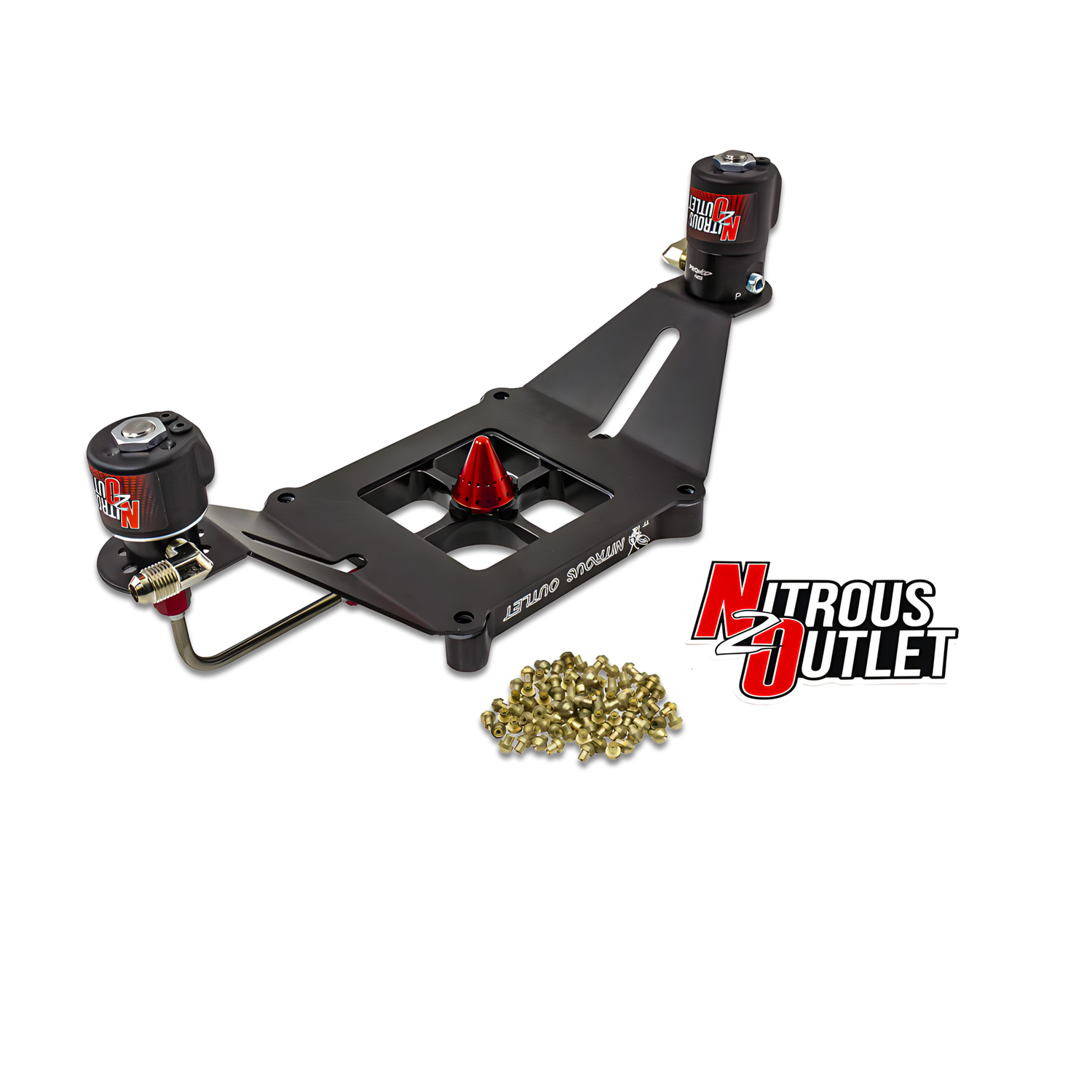 The 4150 plate and cone are manufactured from 6061 billet aluminum. The nitrous plate is .75” thick and black anodized with engraved Nitrous Outlet logos and Fuel / N2O entry marking. The cone is anodized red and features 16 nitrous discharge holes and 16 fuel discharge holes. Premium gaskets are included as well as Jetting for 50-100-150-200-250-300-350-400-450-500 horsepower shots. We even include fuel jetting for gasoline and E85! This is a standard system and utilizes a .122 nitrous solenoid and .177 fuel solenoid. Custom pre-bent stainless hardlines are included to connect the solenoids to the plate, as is our Deep Break Solenoid Bracket.
