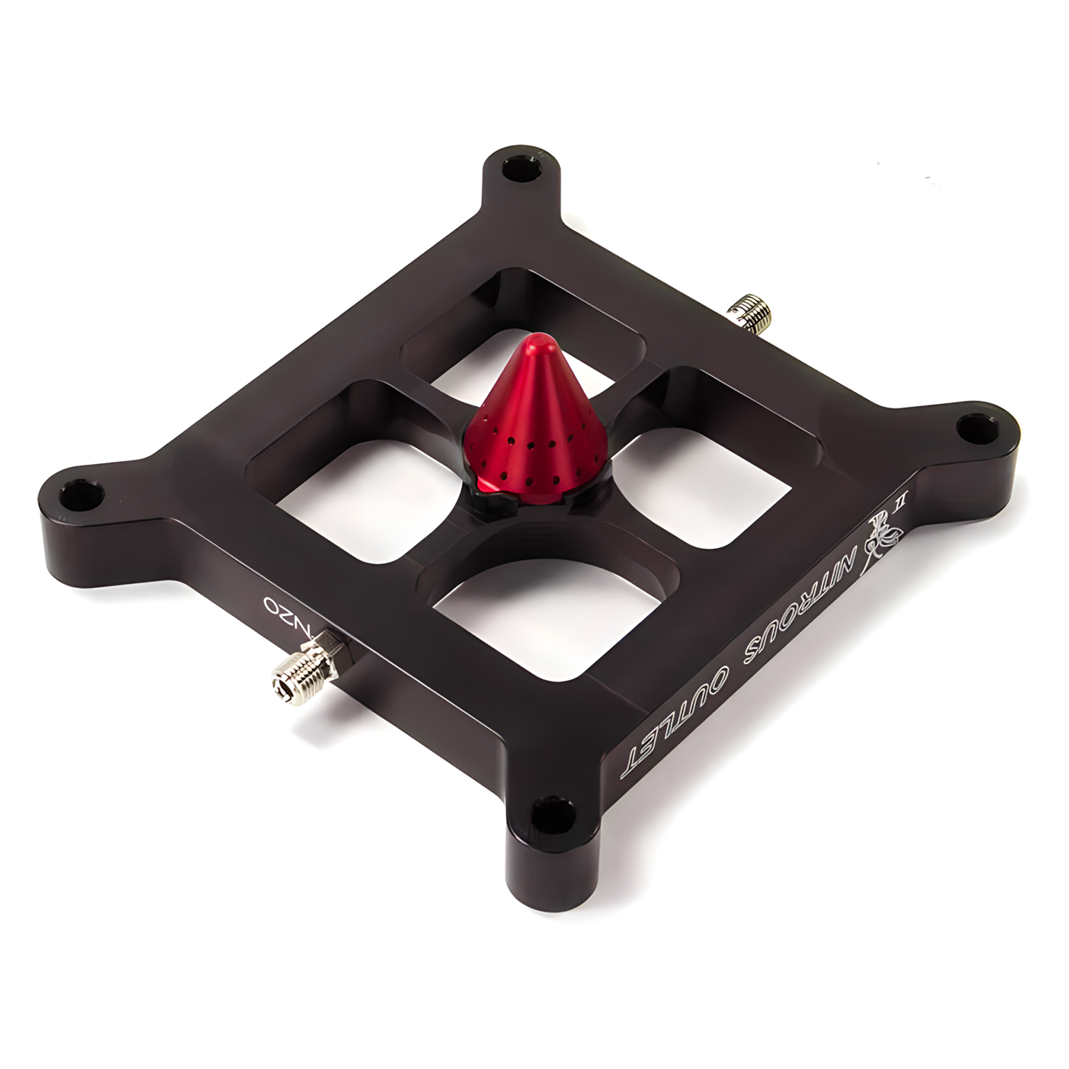 The Stinger 2 is a single-entry nitrous plate that provides a max flow of 634hp. The fuel discharge ports are on top and discharge at a downward angle towards the horizontal nitrous discharge. The nitrous will mix into the air stream allowing the engine vacuum to pull it into the cylinder. This is a perfect plate for intake manifolds that do not have a tall deck height from the top of the runner to the carburetor flange.