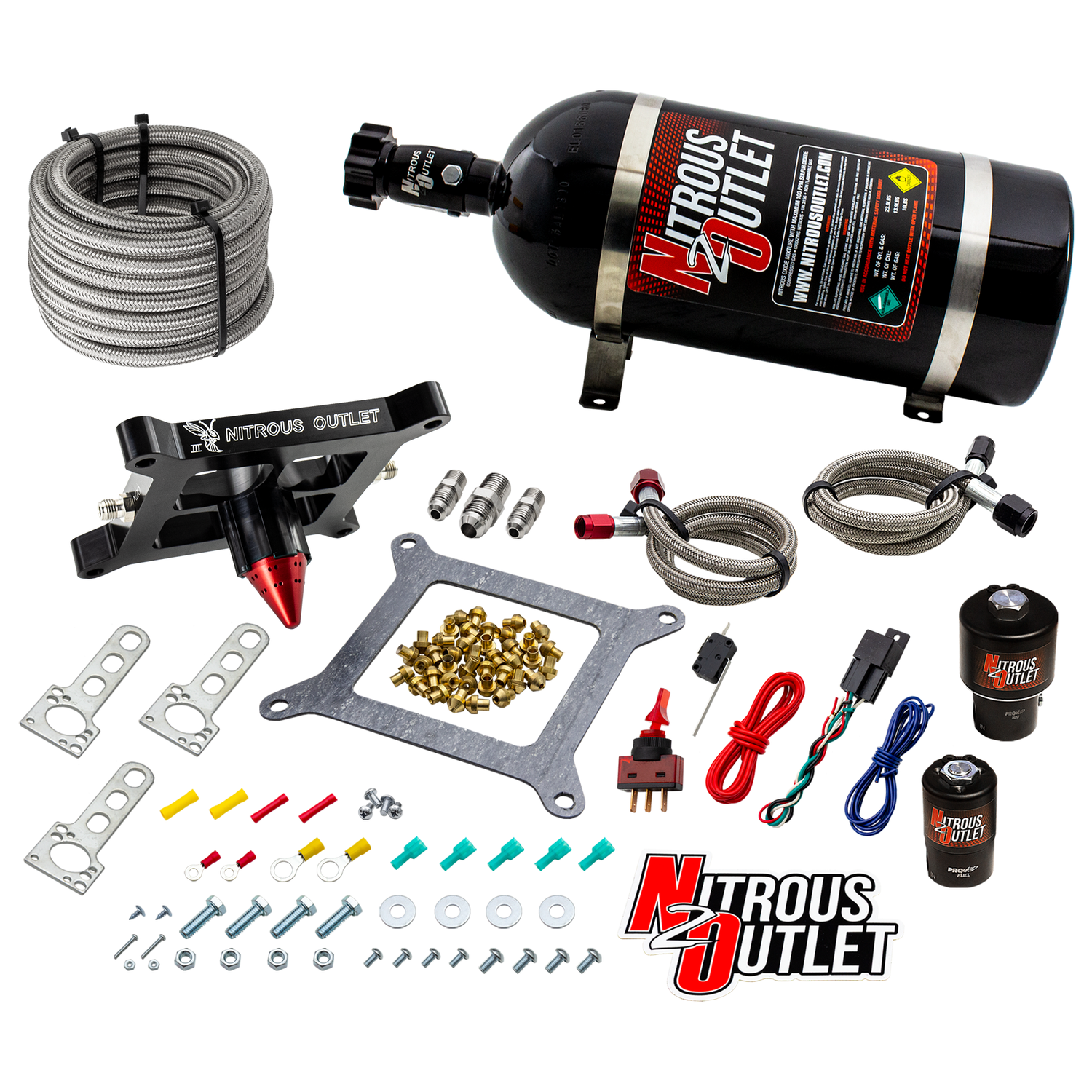The 4150 plate and cone are manufactured from 6061 billet aluminum. The nitrous plate is .75” thick and black anodized with engraved Nitrous Outlet logos and Fuel / N2O entry marking. The cone is anodized red and features 16 nitrous discharge holes and 16 fuel discharge holes that discharge 1-7/8" below the carb flange. Premium gaskets are included as well as Jetting for 50-100-150-200-250-300-350-400-450-500-550-600 horsepower shots. We even include fuel jetting for gasoline and E85! This is a race system and utilizes a .178 nitrous solenoid and .310 fuel solenoid. Braided stainless hoses are included to connect the solenoids to the plate, as are universal solenoid brackets.