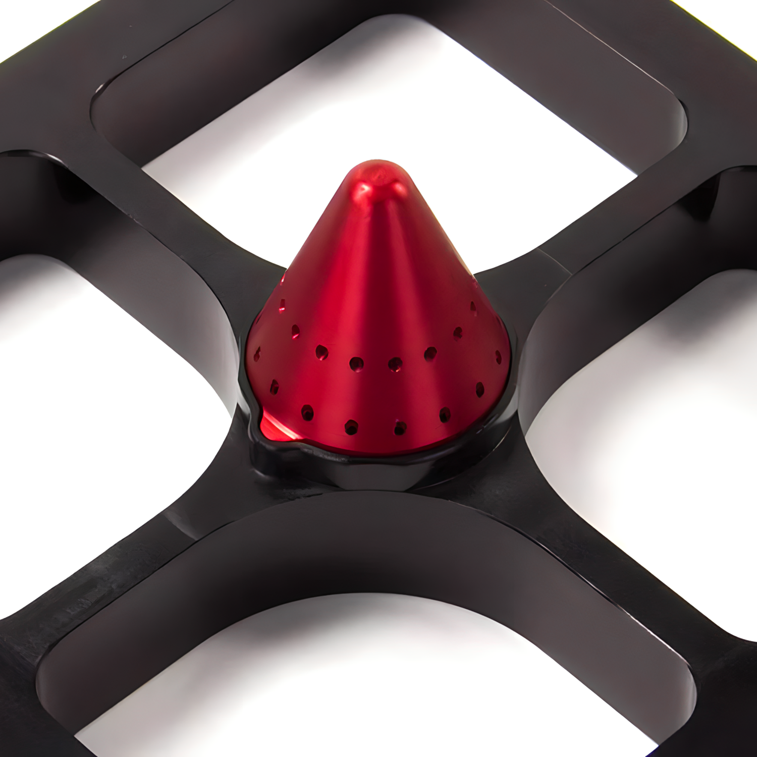 The 4500 plate and cone are manufactured from 6061 billet aluminum. The nitrous plate is .75” thick and black anodized with engraved Nitrous Outlet logos and Fuel / N2O entry marking. The cone is anodized red and features 16 nitrous discharge holes and 16 fuel discharge holes. Premium gaskets are included as well as Jetting for 50-100-150-200-250-300-350-400-450-500 horsepower shots. We even include fuel jetting for gasoline and E85! This is a standard system and utilizes a .122 nitrous solenoid and .177 fuel solenoid. Custom pre-bent stainless hardlines are included to connect the solenoids to the plate, as is our popular Boomerang Solenoid Bracket.