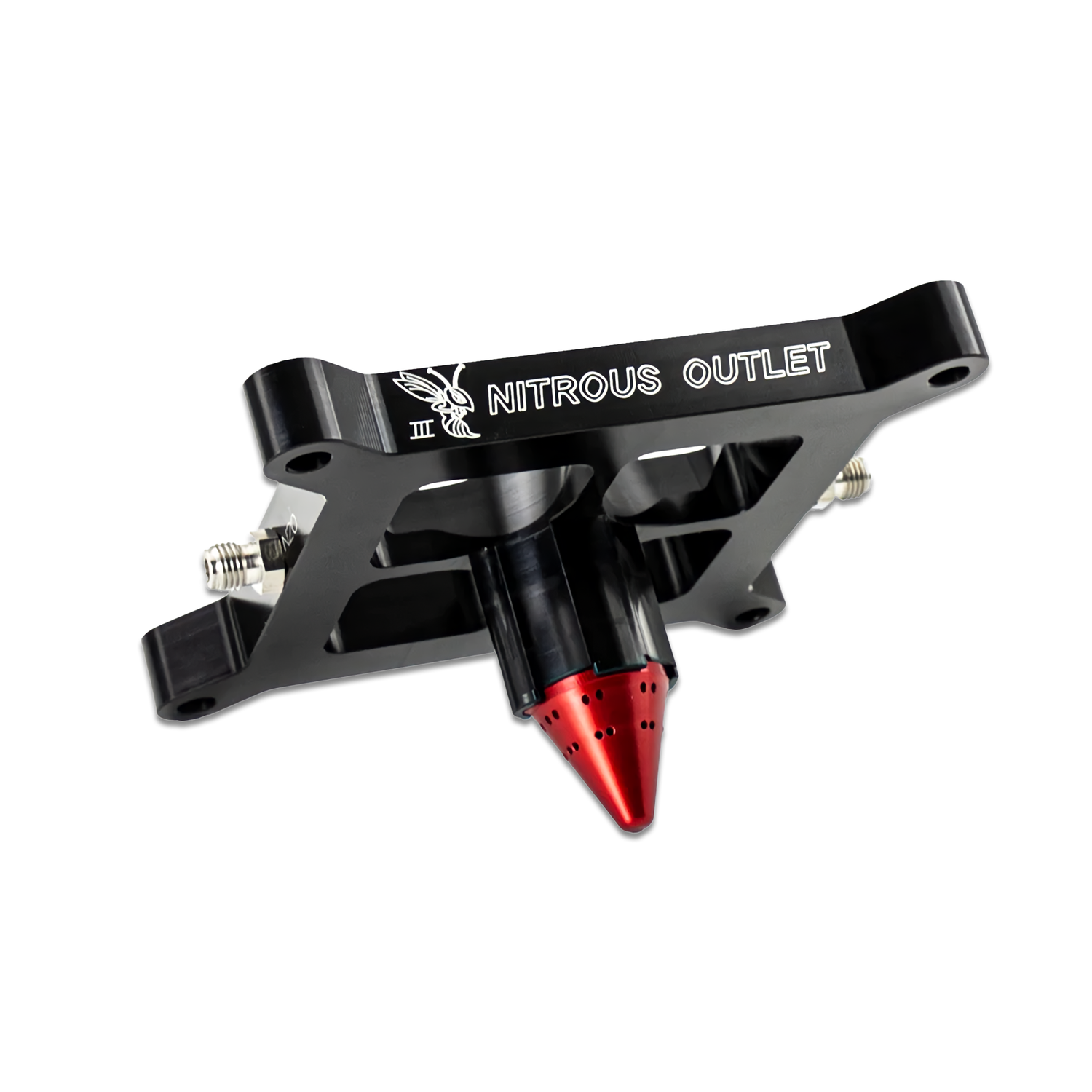 The 4500 plate and cone are manufactured from 6061 billet aluminum. The nitrous plate is .75” thick and black anodized with engraved Nitrous Outlet logos and Fuel / N2O entry marking. The cone is anodized red and features 16 nitrous discharge holes and 16 fuel discharge holes that discharge 1-7/8" below the carb flange. Premium gaskets are included as well as Jetting for 50-100-150-200-250-300-350-400-450-500 horsepower shots. We even include fuel jetting for gasoline and E85! This is a standard system and utilizes a .122 nitrous solenoid and .177 fuel solenoid. Custom bent stainless hard lines are included to connect the solenoids to the plate, as is our Deep Break Solenoid Bracket.