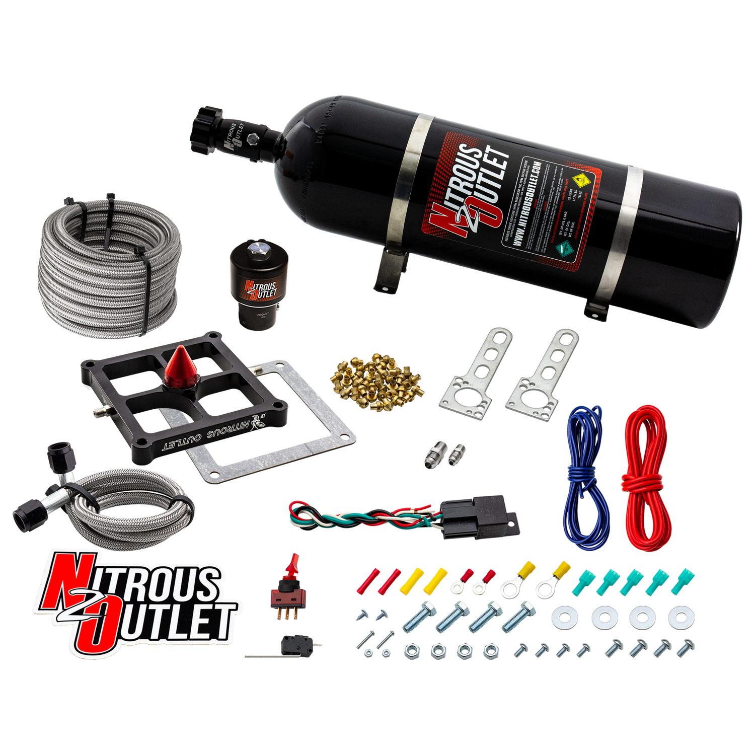 The 4500 plate and cone are manufactured from 6061 billet aluminum. The nitrous plate is .75” thick and black anodized with engraved Nitrous Outlet logos and N2O entry marking. The cone is anodized red and features 16 nitrous discharge. Premium gaskets are included as well as Jetting for 50-100-150-200-250-300-350-400-450-500-550-600 horsepower shots. This is a dry race nitrous plate kit and utilizes a .178 nitrous solenoid. Braided stainless hoses are included to connect the solenoids to the plate, as are universal solenoid brackets. Choose your nitrous bottle option above.