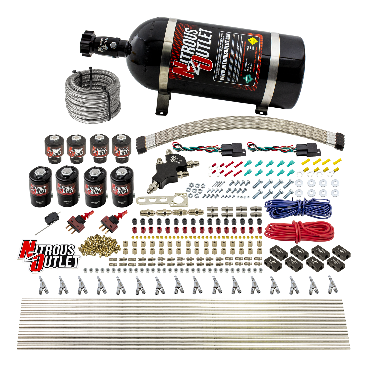This system includes all of the necessary components; four .122 nitrous solenoids and four .177 fuel solenoids, 16 Titanium Vortex Ti 1/16" NPT wet nitrous nozzles, 30ft of hardline, all jetting, hardware, and electrical to install a direct port nitrous system capable of adding 800 HP per stage to your vehicle.