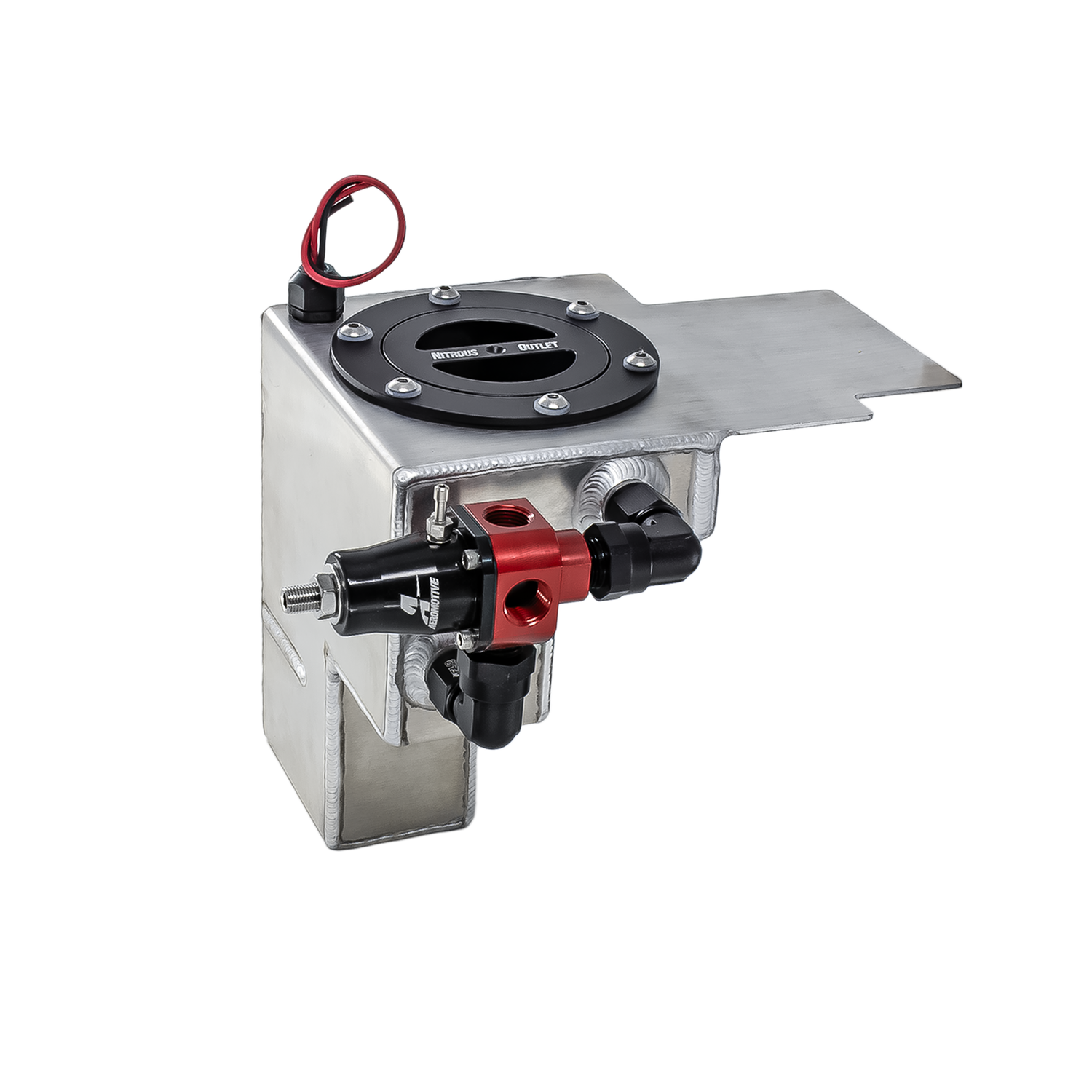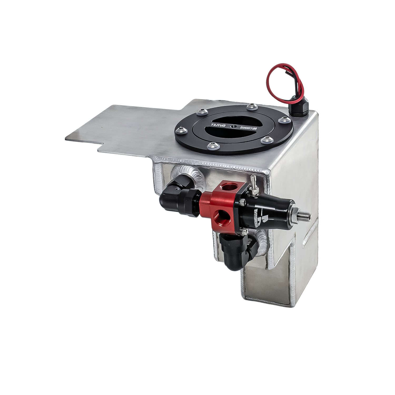 Heavy Duty Construction. Nitrous Outlet's dedicated fuel systems come complete with a custom built hand welded 0.63 gallon fuel cell, mounting brackets, E85 compatible in tank fuel pump, Aeromotive fuel regulator, Aeroquip 6 An hose, fuel lines, and fittings.