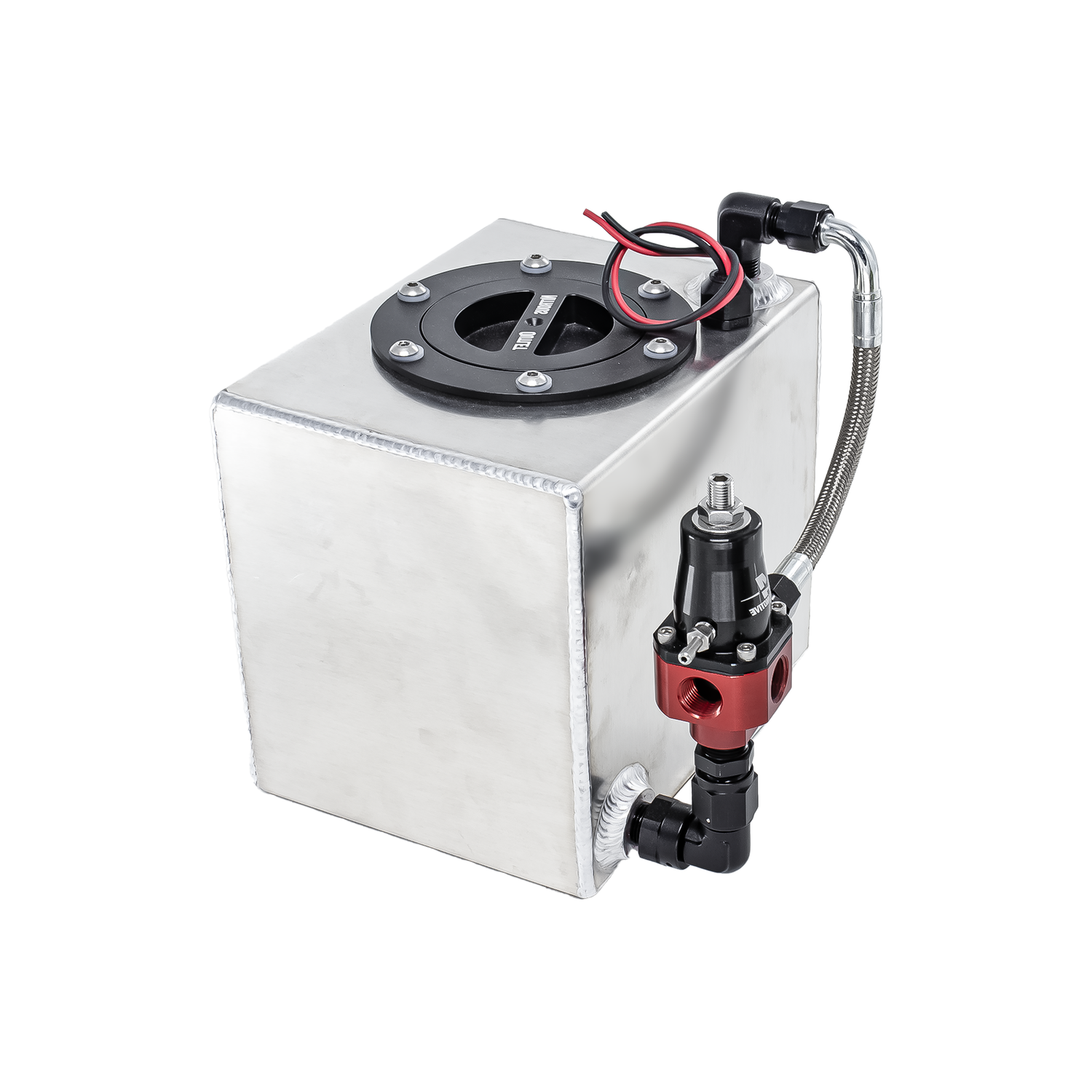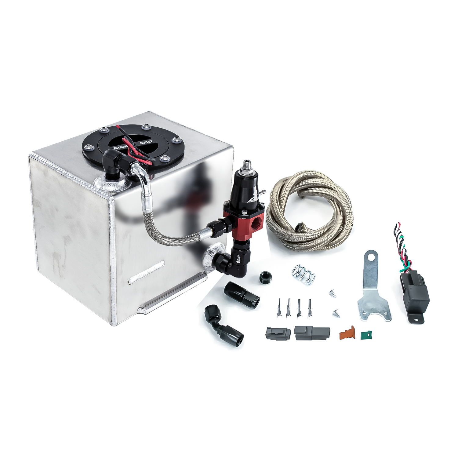 Heavy Duty Construction. Nitrous Outlet's dedicated fuel systems come complete with a custom built hand welded 1.16 gallon fuel cell, mounting brackets, E85 compatible in tank fuel pump, Aeromotive fuel regulator, Aeroquip 6 An hose, fuel lines, and fittings.