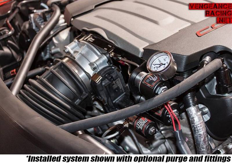 This system is designed specifically for the 2014-2019 LT1 C7 Corvette using the stock intake manifold. A custom solenoid bracket and prefabricated hard-lines bolt directly between the throttle body and intake manifold.