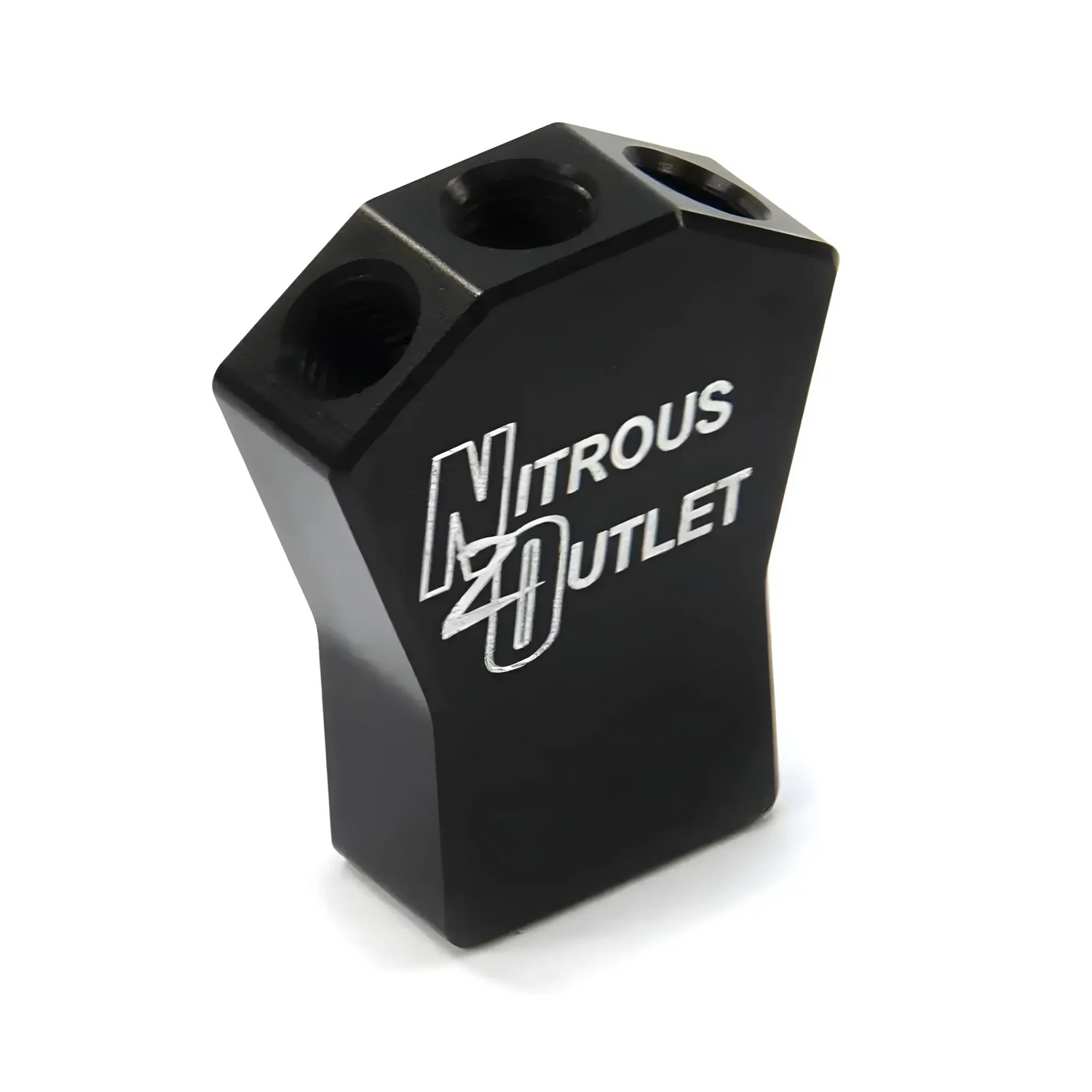 The Nitrous Outlet compact billet distribution blocks are CNC machined for precise flow and a nice clean look. Each distribution block is anodized black and laser etched with the Nitrous Outlet logo and has 1 inlet, and 3 outlet ports.