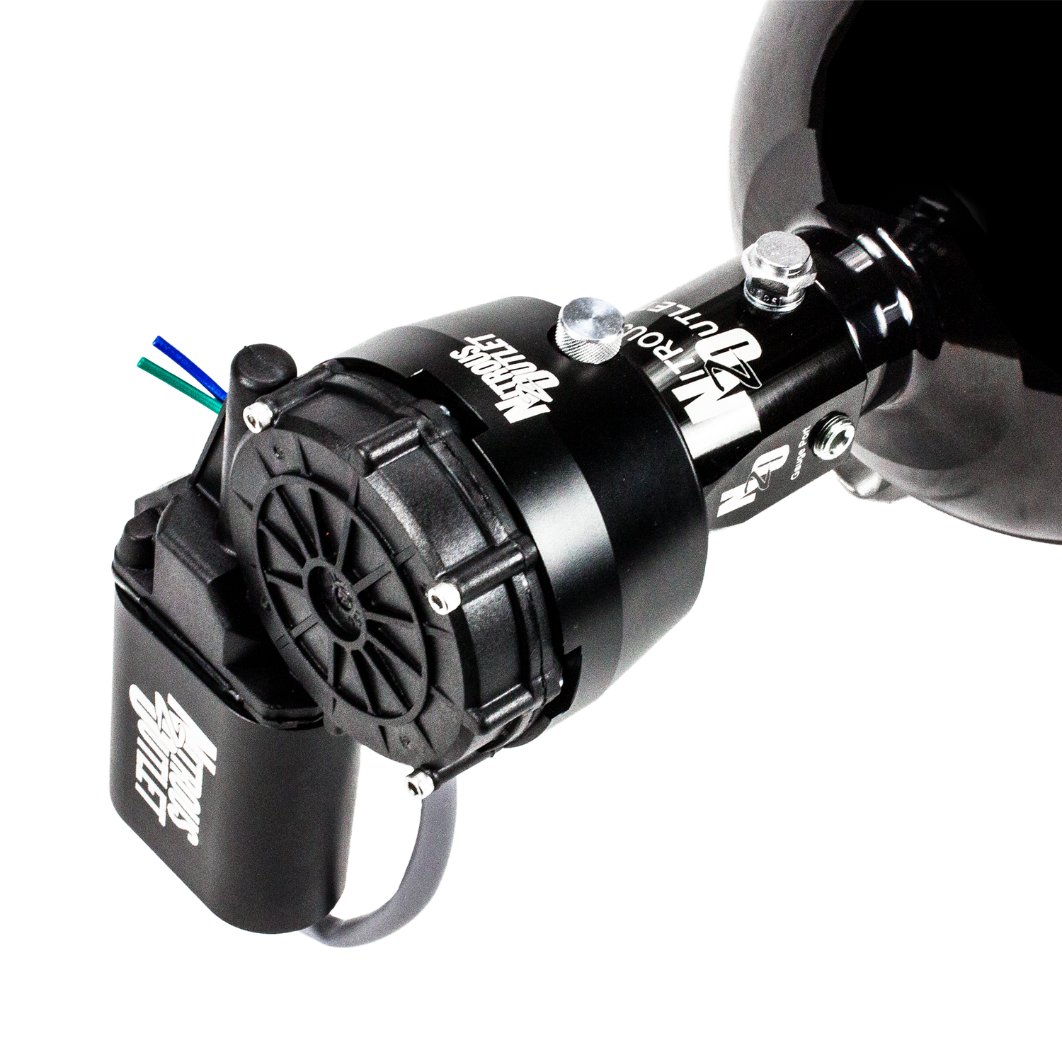 Our high-torque motor operates on 12v and will fully open and close the valve under full bottle pressure. The collar, spacer, and motor cover are all manufactured from 6061 aluminum, black anodized, and laser etched with the Nitrous Outlet logo.